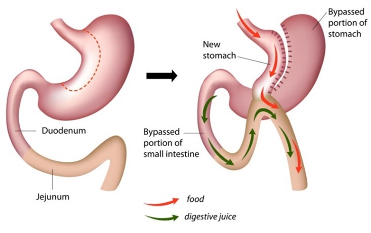 The second stage: Gastric bypass, in which a path (connection) is made between the stomach and the small intestine, resulting in a reduction in the proportion of food and calories absorbed into the circulatory system.